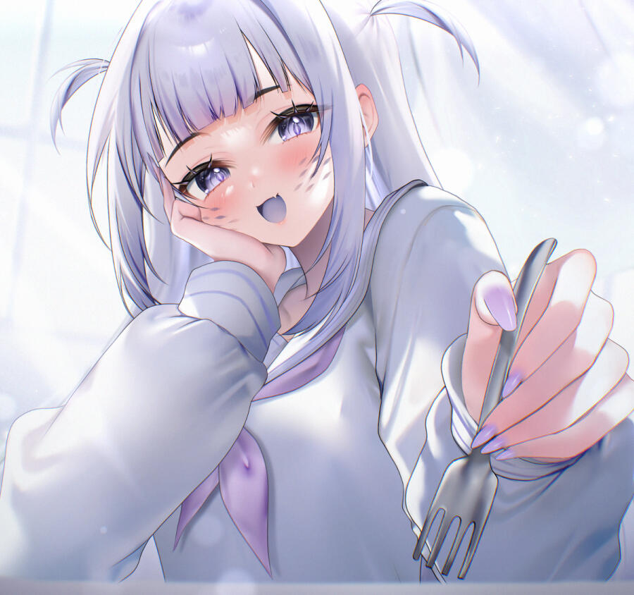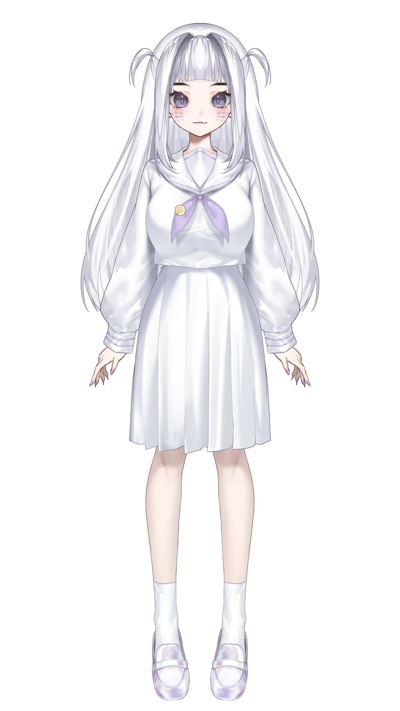 Lavender-colored nail polish.Self-made all-white seifuku with a lavender accent.A golden narutomaki pin as her accessory.Pearlescent White shoes.White Choker Collar is optional!